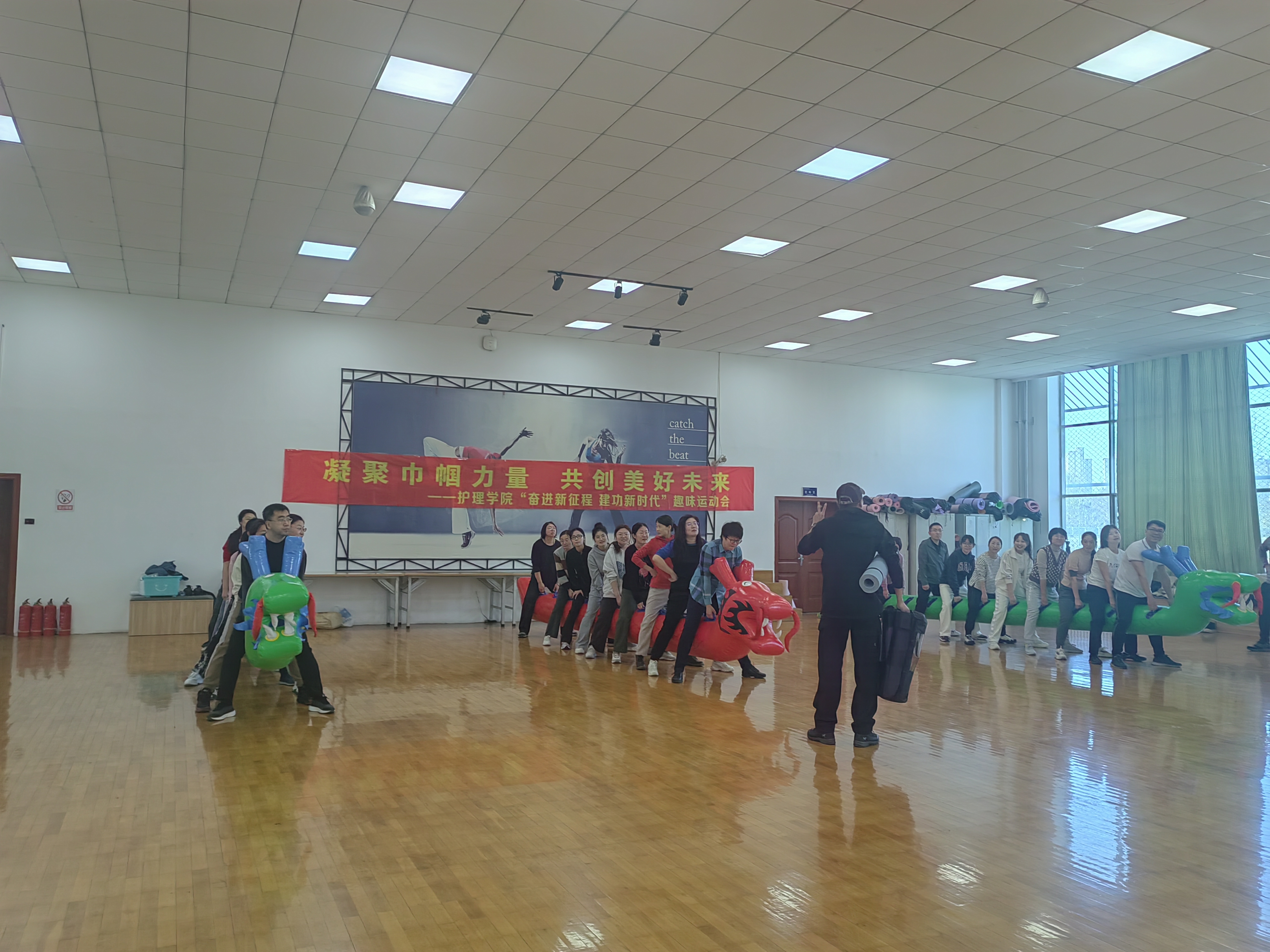 在趣味运动会正式开始前,通过各种热身活动,调动起老师们的热情和积极性,做好运动前准备。趣味运动会共有同舟共济、U型槽传球、天旋地转、谁是画家等四个项目,将所有老师分成三组。在旱地龙舟上,老师们同舟共济,齐心协力向前冲;在传球环节,老师们配合默契,展示团队协作的重要性;在天旋地转项目,考验了参加老师的技巧和体能;“谁是画家”虽不是运动项目,却给老师们带来开心欢乐。