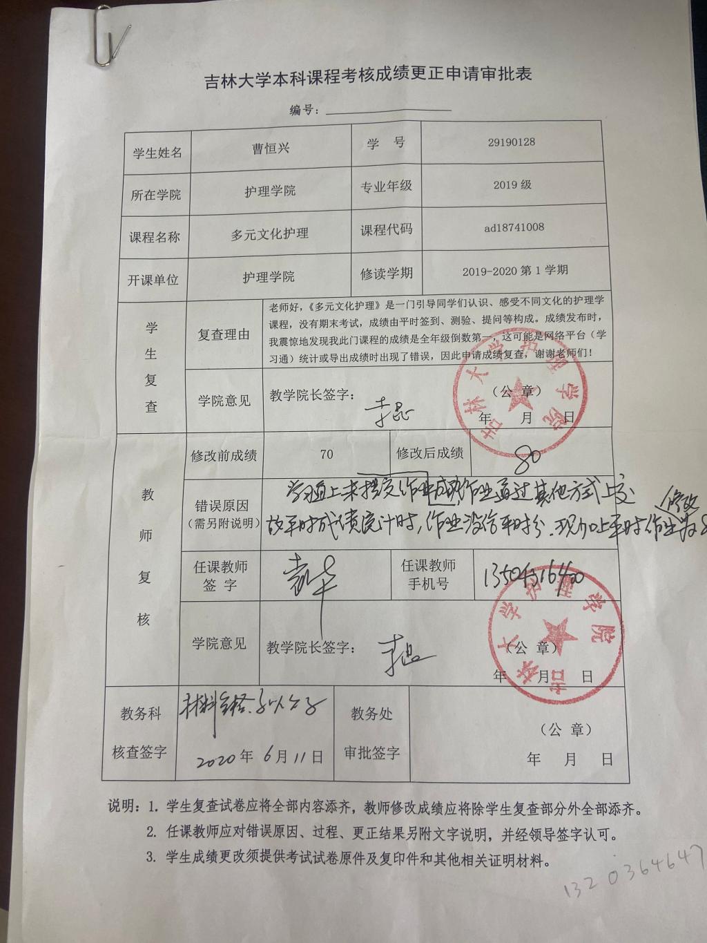 根据《关于进一步明确本科生课程考核等有关问题的通知》(校教字〔2018〕47号)文件有关精神,现对2019级曹恒兴同学(学号:29190128)2019-2020-1学期课程成绩更正如下: