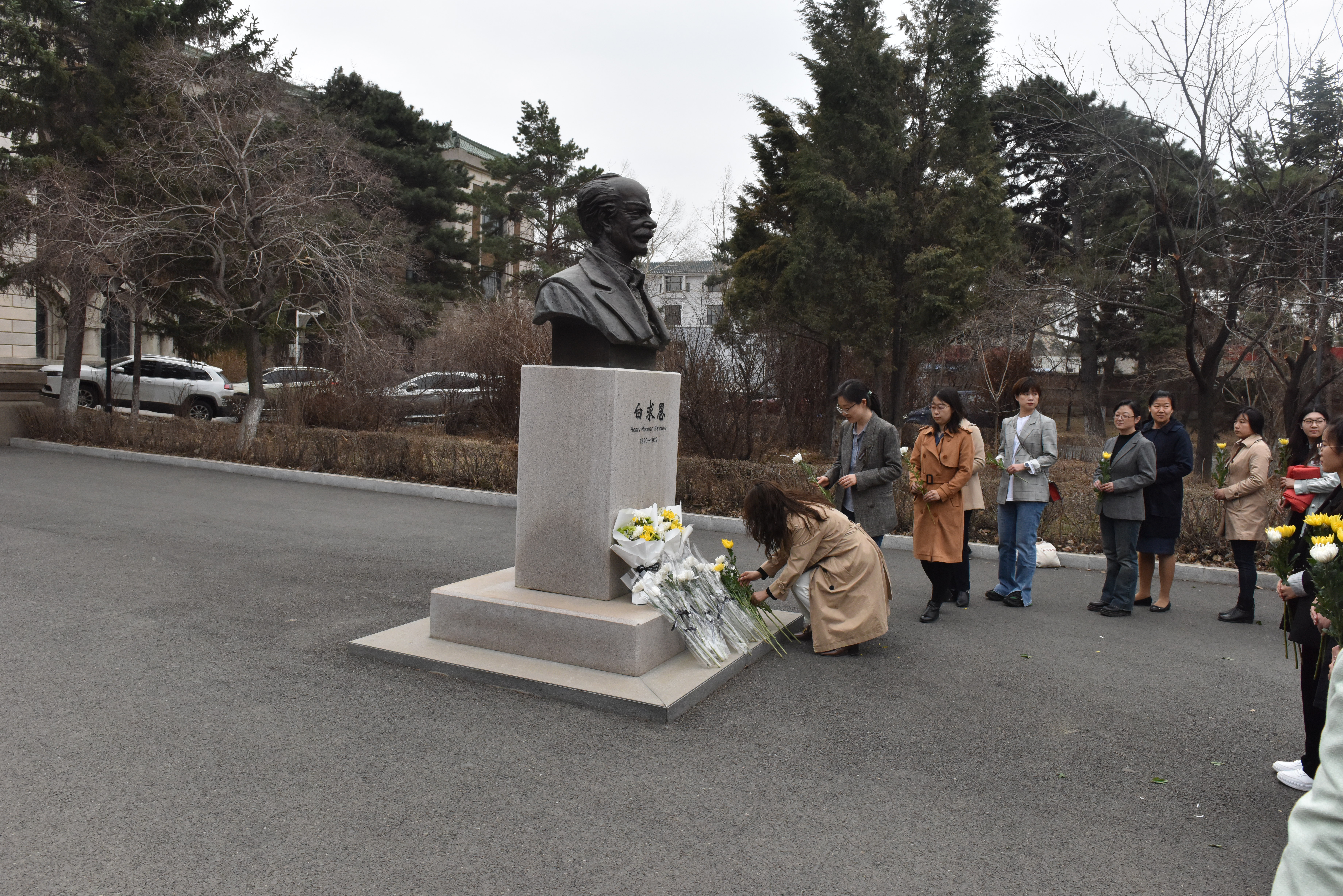 4月2日中午,在医学部院内的白求恩雕像前,bevictor1946韦德官网全体教职工党员及员工党员代表,开展“缅怀先烈事迹,传承白求恩精神”为主题的清明节主题党日活动。在庄严的白求恩像前,全体党员通过默哀、敬献鲜花的方式,表达了对国际共产主义战士白求恩同志的哀思。