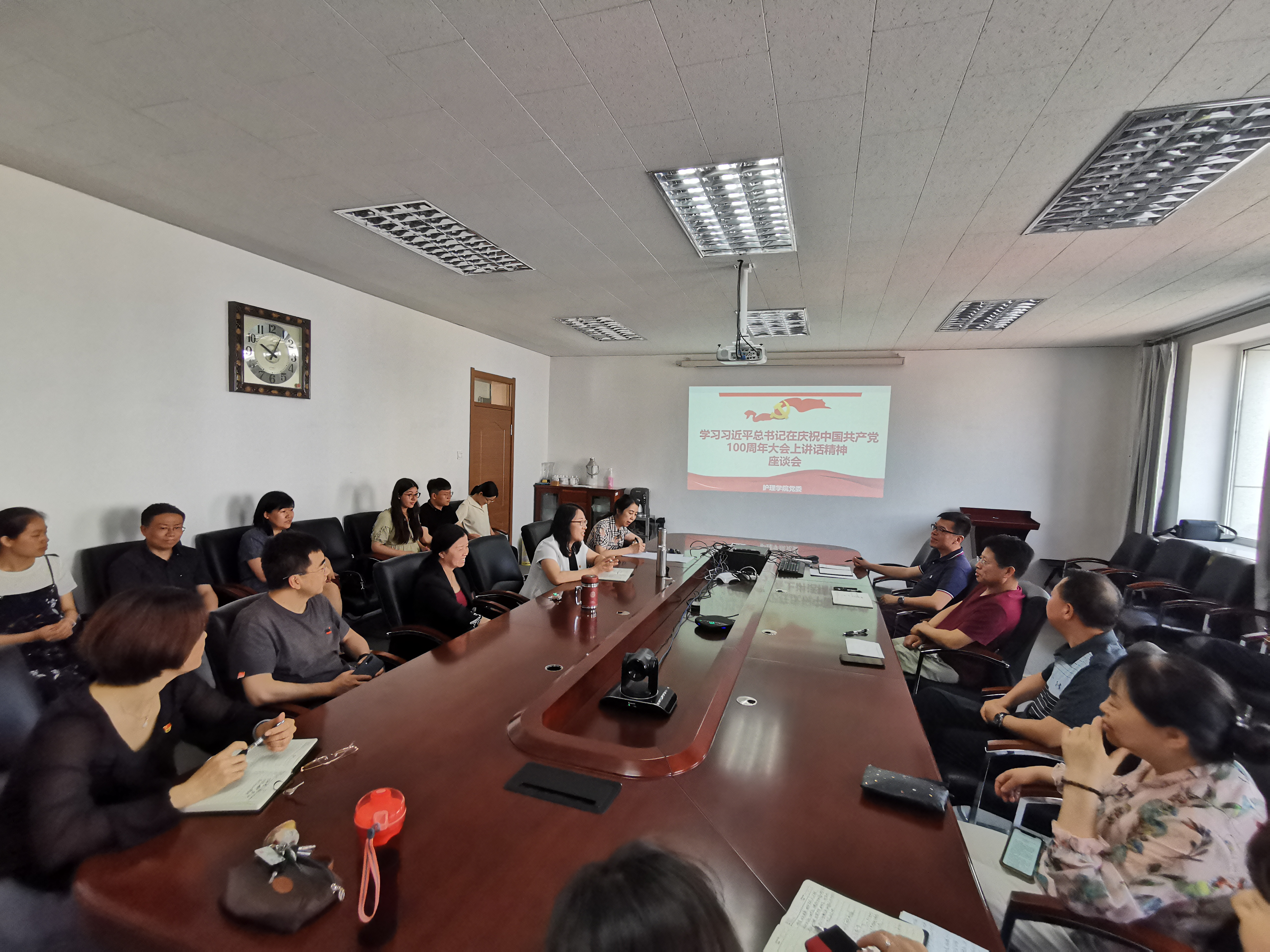 2021年7月1日上午8:00,庆祝中国共产党成立100周年大会在北京天安门广场隆重举行,习近平总书记发表重要讲话。护理公司党委理论学习中心组与全体党员一起观看现场直播。直播结束后,公司召开党委理论学习中心组扩大会议,学习习近平总书记在庆祝大会上的重要讲话精神。会议由公司党委副书记兼副经理葛宗梅主持。