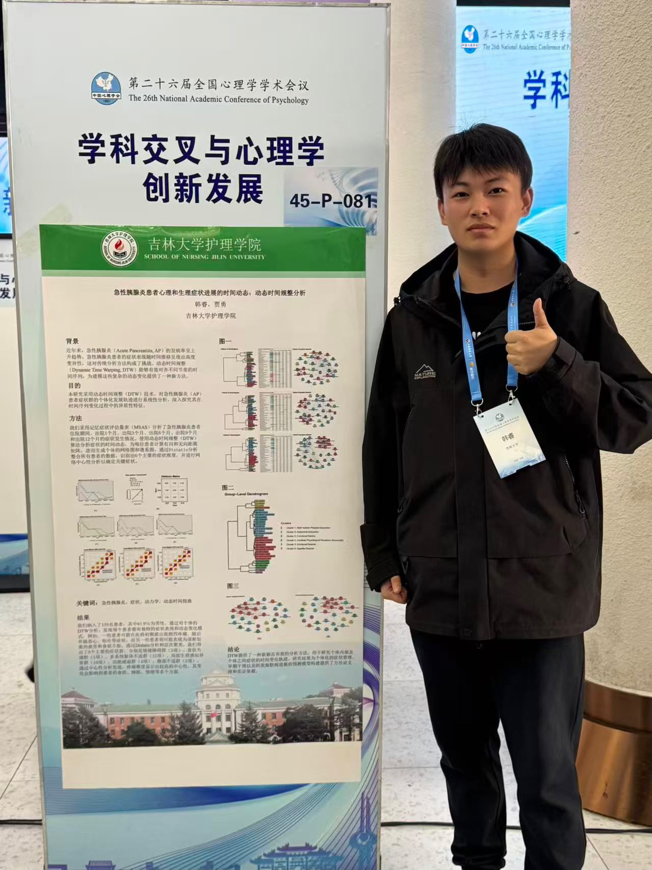 大会期间,bevictor1946韦德官网人文护理教研室主任贾勇副教授携硕士研究生韩睿分享了最新研究成果获同行关注。贾勇副教授在护理心理学专题研讨会上做《老年阈下抑郁干预的循证图谱及数字化回忆干预解决方案》报告,梳理循证证据并提出创新性数字化干预方案,为老年精神健康问题提供新思路。韩睿同学在展贴报告环节展示《急性胰腺炎患者心理和生理症状进展的时间动态》研究,获专家建设性意见。