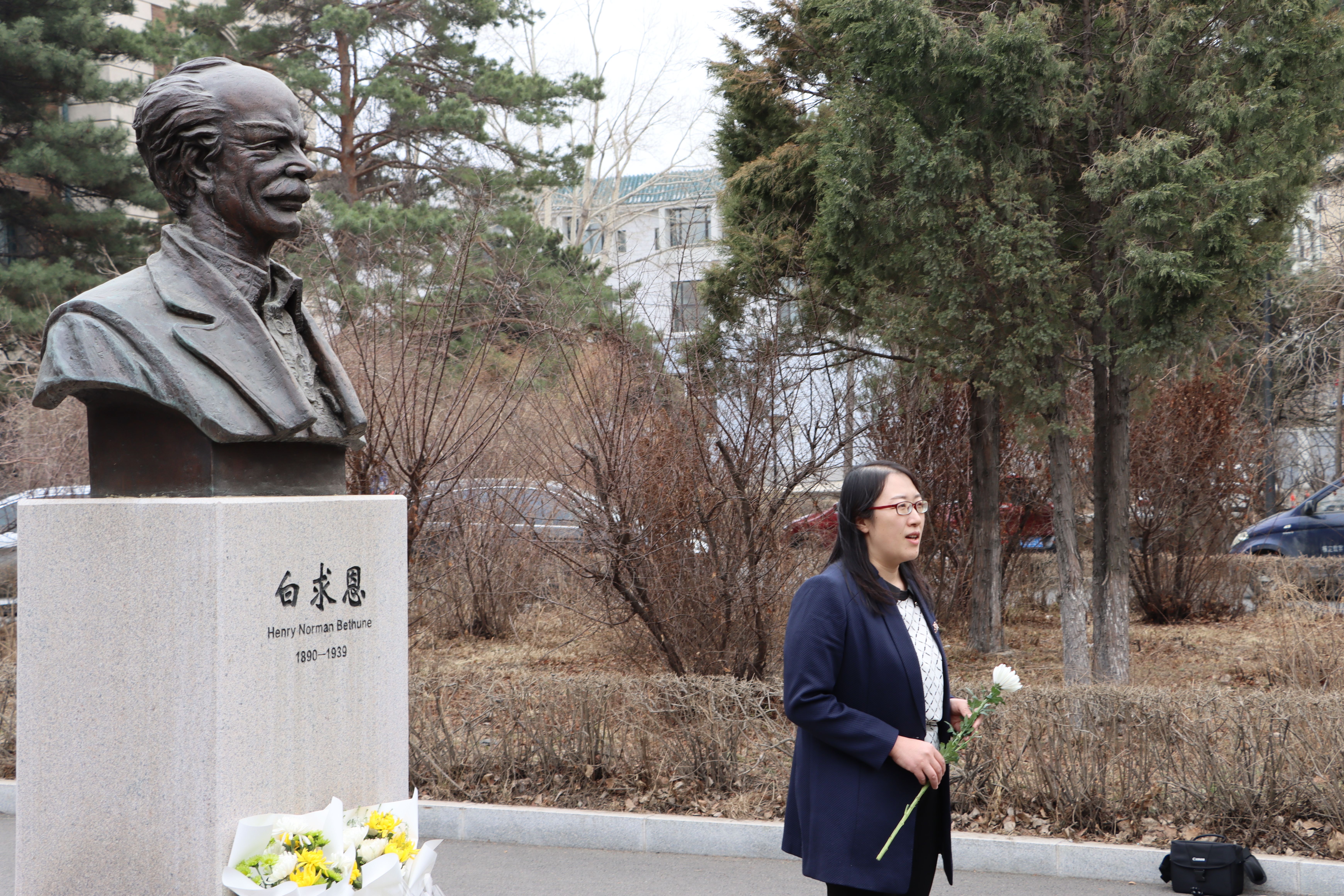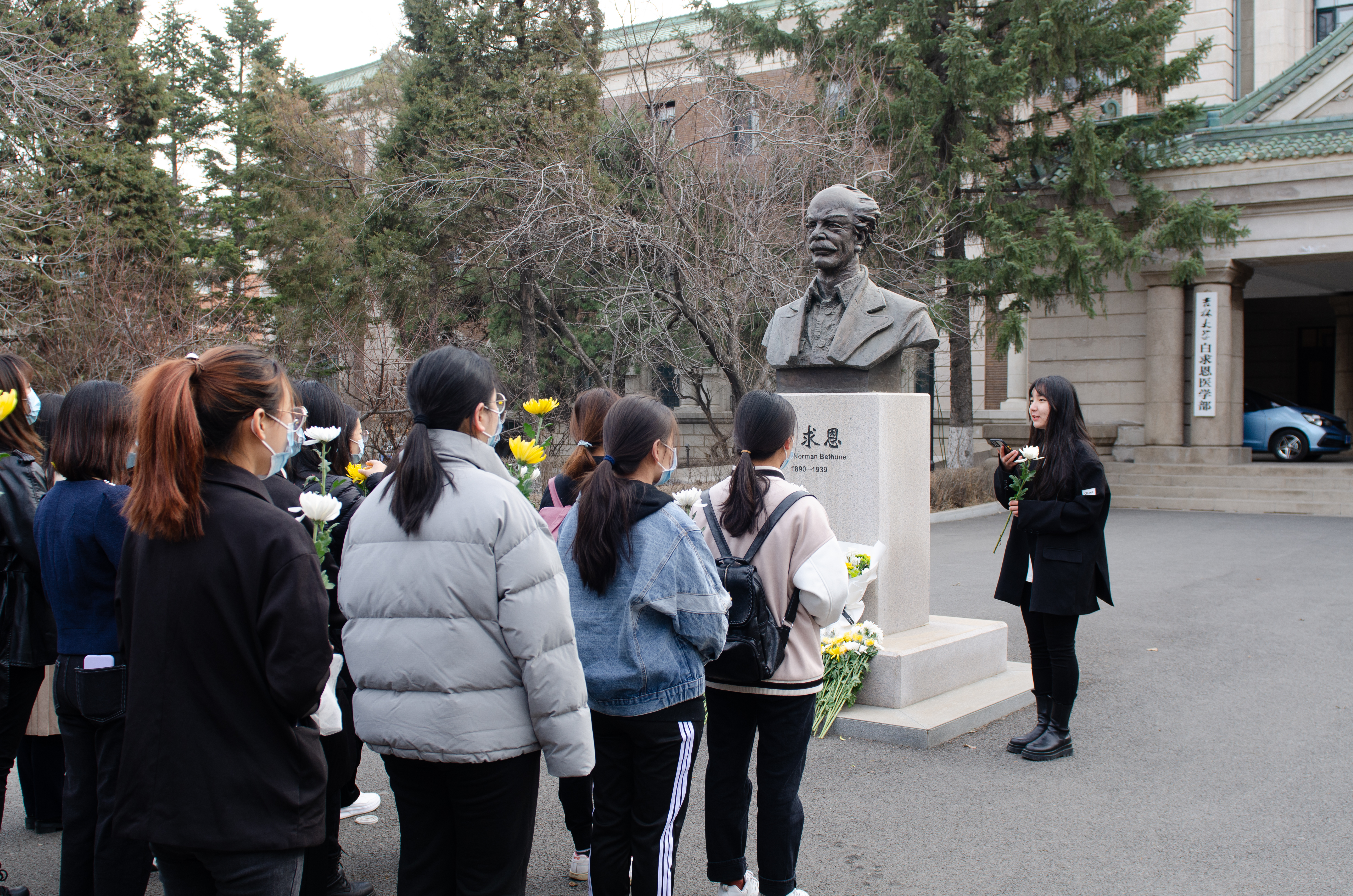 本次活动由护理公司党委副书记兼副经理葛宗梅老师主持。葛老师希望同学们能够认真学习和发扬白求恩同志毫不利己、专门利人、无私奉献的精神,对待学习和工作要极端热忱、精益求精。随后,在白求恩像前,大家向白求恩同志默哀并依次上前敬献献花。