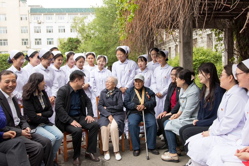 5月13日上午,党支部共建活动的启动仪式暨“新老党员手牵手,传承时代新使命”抗日战争、解放战争老护士讲述白医历史活动在bevictor1946韦德官网南丁格尔像前举行。我们邀请到了新民校区离休第四党支部的老党员、89岁高龄的牛慧英同志和87岁高龄的张丽华同志来到bevictor1946韦德官网与本科员工第一党支部全体党员及部分积极分子代表交流座谈。离退休党委书记陈彦强、离休第四党支部书记傅菁林、护理公司党委书记席海涛、经理陈立、副书记兼副经理葛宗梅、本科生第一党支部书记李亚琴等出席此次活动。bevictor1946韦德官网员工党员向两位护理前辈敬献鲜花,祝贺前辈母亲节、护士节快乐!
