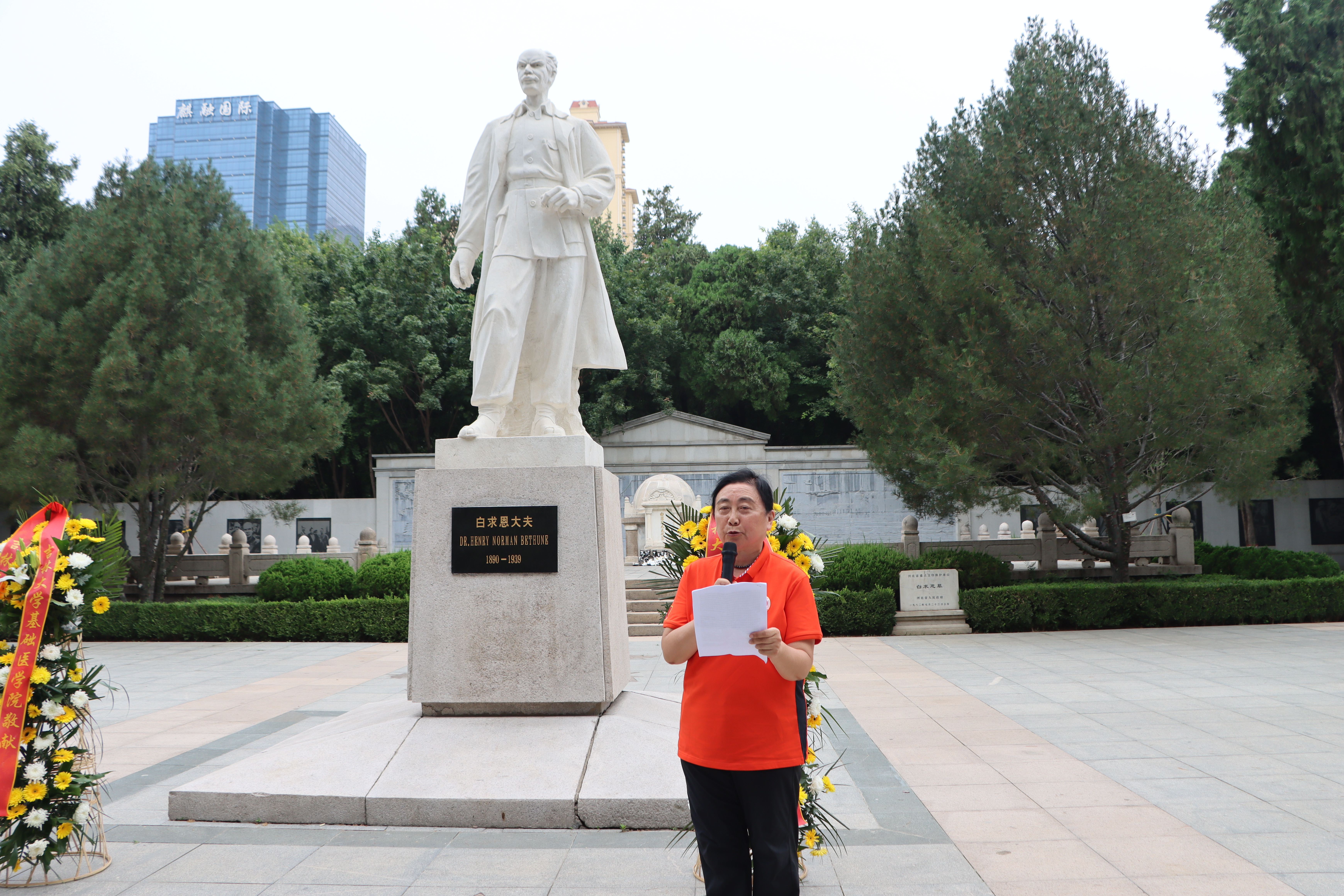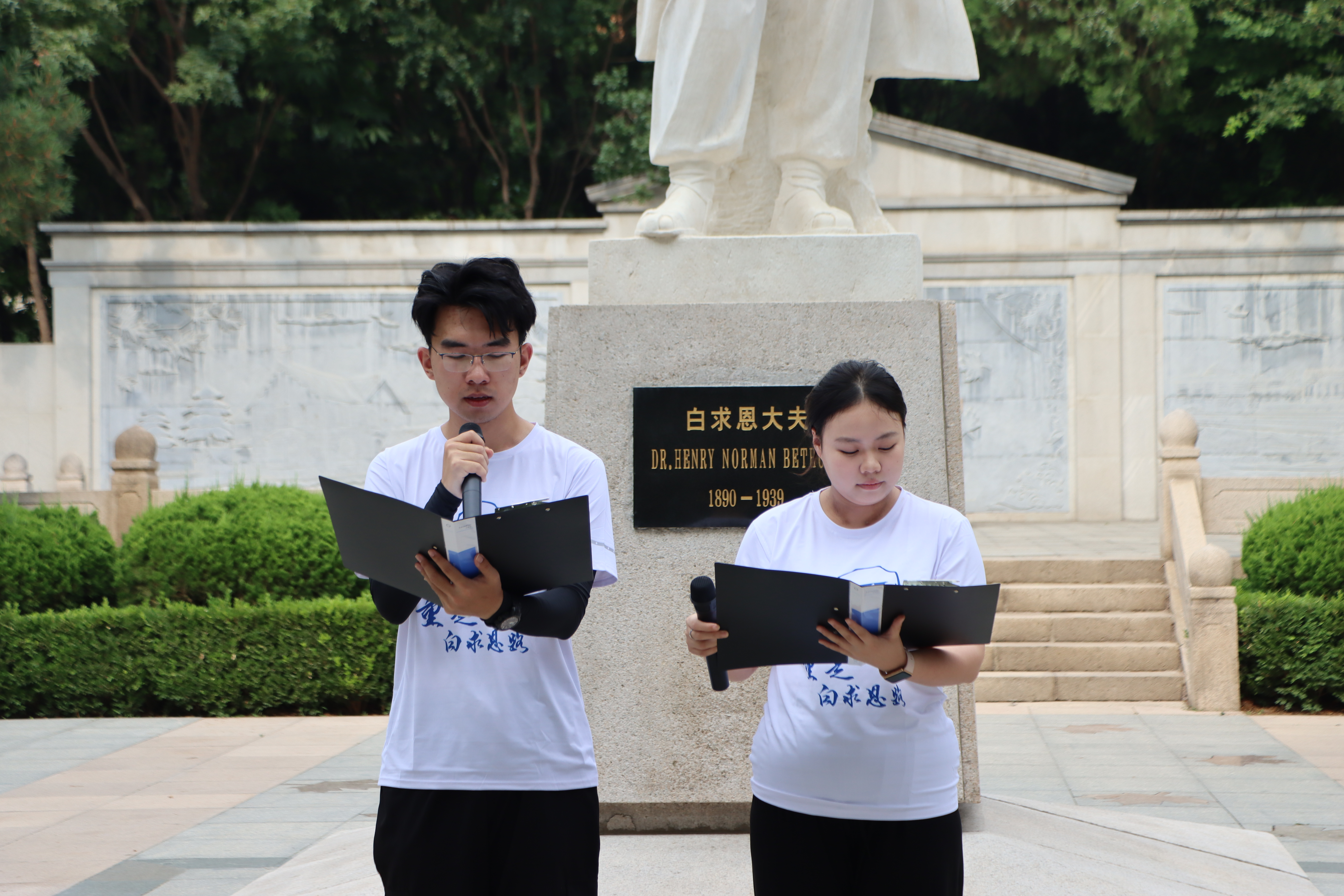 在白求恩墓前,全体师生面向白求恩像默哀一分钟,在无声静默中表达对白求恩同志的深切哀思。bevictor1946韦德官网与基础医公司员工代表共同朗诵《纪念白求恩》,在声声朗诵中抒发对白求恩同志的敬佩与怀念,表达弘扬和践行白求恩精神的决心。随后,员工代表向白求恩墓敬献花篮,队员们依次向白求恩墓献花。公共卫生公司员工代表发言,表明作为一名医员工,要坚定信念信心,传承发扬国际主义精神。bevictor1946韦德官网关工委副主任、离退休党委纪委委员傅菁林老师致辞,叮嘱志愿者们要赓续红色血脉,做白求恩精神的传承者。最后,全体师生重温医员工誓言,誓言声阵阵入耳,明医志、慰英灵。